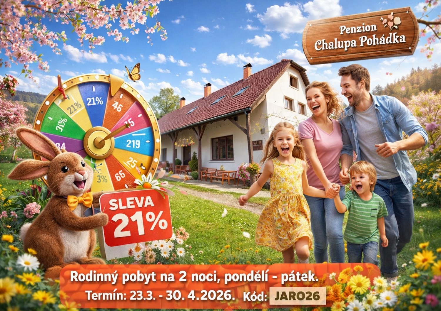 Využijte exkluzivní slevu 21 % na pobyt minimálně na 2 noci během pracovních dnů (pondělí–pátek). Dopřejte si kouzelný jarní únik do přírody a načerpejte novou energii. Platné pro pobyty v termínu 23. 3. – 30. 4. 2026. Sleva platí pouze pro pobyty uskutečněné v uvedeném období a pouze pro rezervace se začátkem a koncem v pracovních dnech (po–pá). Nelze kombinovat s jinými akcemi. Při rezervaci zadejte do poznámky kód: JARO26 a zvýhodněná cena je Vaše. Nečekejte, počet volných termínů je omezený ! Těšíme se na Vás.